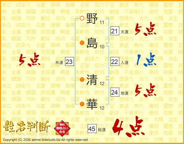野島清華さんの天運は21画の5点!
