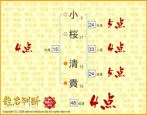 あなたの人生を表す1番重要な運勢です。生涯を通じて影響する総合運となり、主に50歳以降の晩年期に影響を及ぼします。苗字と名前の合計画数。