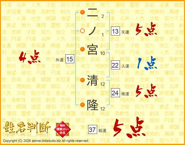 二(2画)ノ(1画)宮(10画) 清(12画)隆(12画)