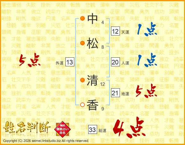 中松清香さんの総運は33画の4点!