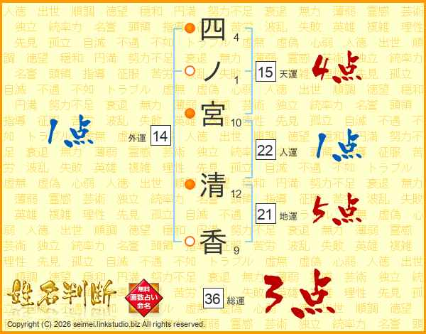 四(4画)ノ(1画)宮(10画) 清(12画)香(9画)