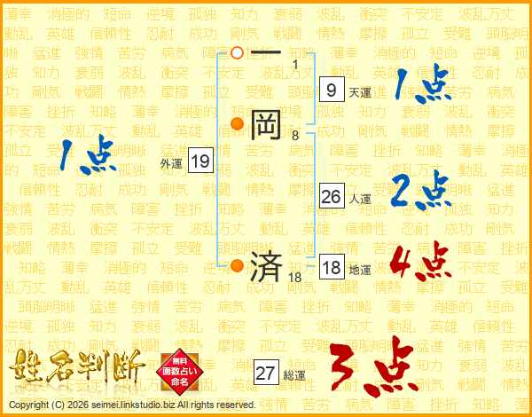 あなたの人生を表す1番重要な運勢です。生涯を通じて影響する総合運となり、主に50歳以降の晩年期に影響を及ぼします。苗字と名前の合計画数。