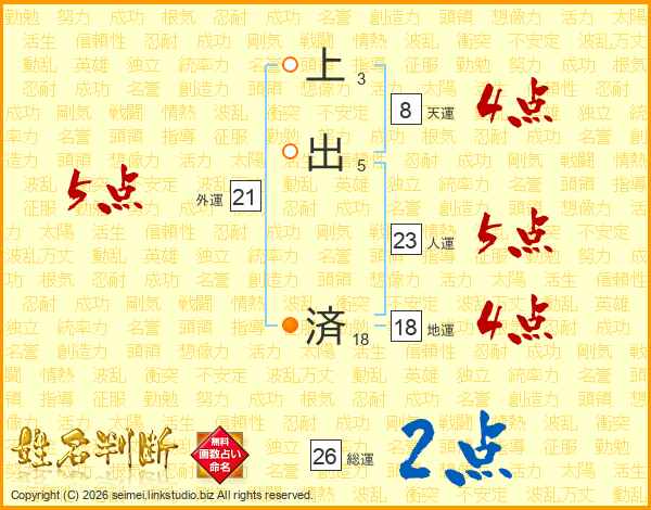 生活面を象徴する運勢です。外部から受ける影響力を表し、結婚運、家庭運や職場、環境への順応性を表します。総運から人運を引いた画数。姓や名が1文字の場合を除く。