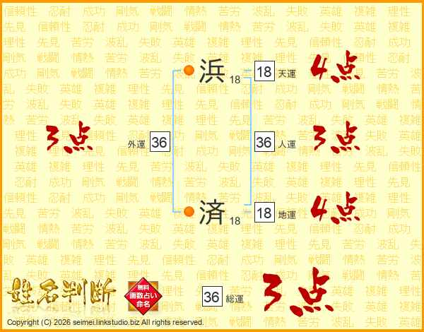 あなたの人生を表す1番重要な運勢です。生涯を通じて影響する総合運となり、主に50歳以降の晩年期に影響を及ぼします。苗字と名前の合計画数。