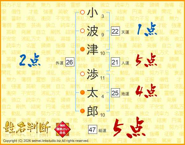小(3画)波(9画)津(10画) 渉(11画)太(4画)郎(10画)