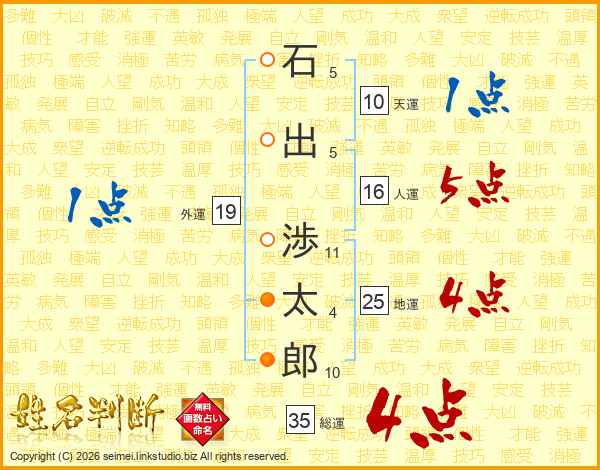 石(5画)出(5画) 渉(11画)太(4画)郎(10画)