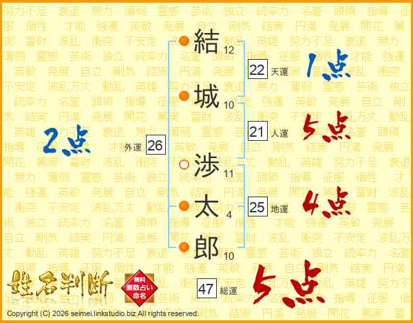 結(12画)城(10画) 渉(11画)太(4画)郎(10画)
