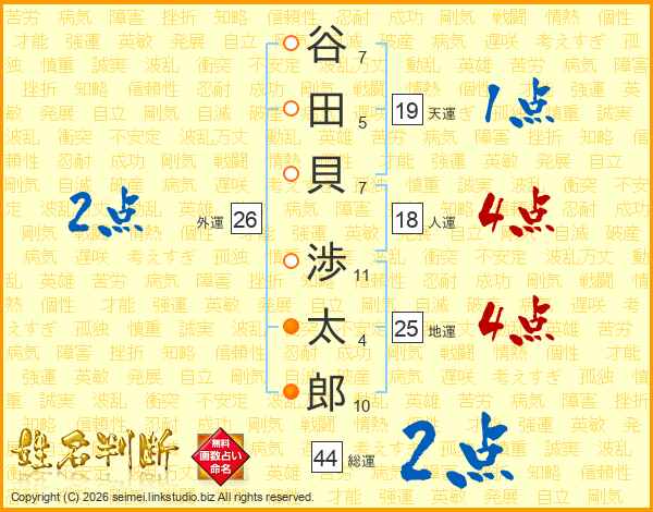 谷(7画)田(5画)貝(7画) 渉(11画)太(4画)郎(10画)