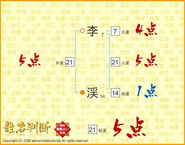 生活面を象徴する運勢です。外部から受ける影響力を表し、結婚運、家庭運や職場、環境への順応性を表します。総運から人運を引いた画数。姓や名が1文字の場合を除く。