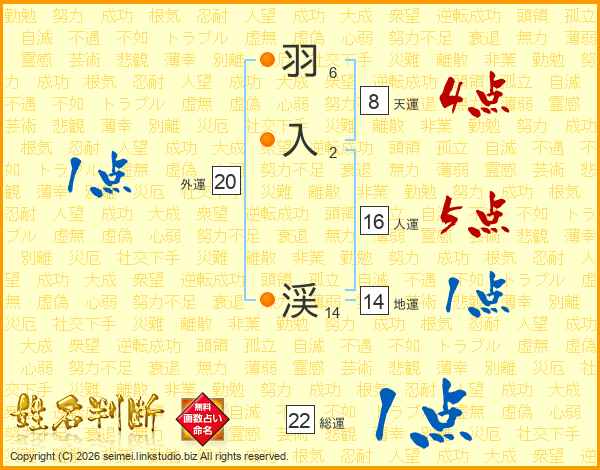 生活面を象徴する運勢です。外部から受ける影響力を表し、結婚運、家庭運や職場、環境への順応性を表します。総運から人運を引いた画数。姓や名が1文字の場合を除く。