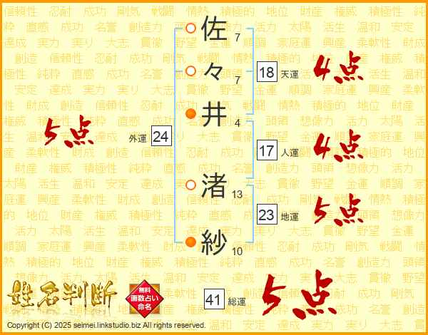 佐(7画)々(7画)井(4画) 渚(13画)紗(10画)