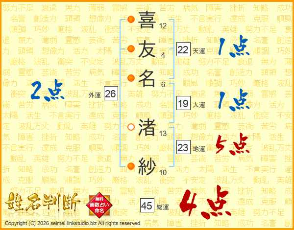 喜友名渚紗さんの総運は45画の4点!