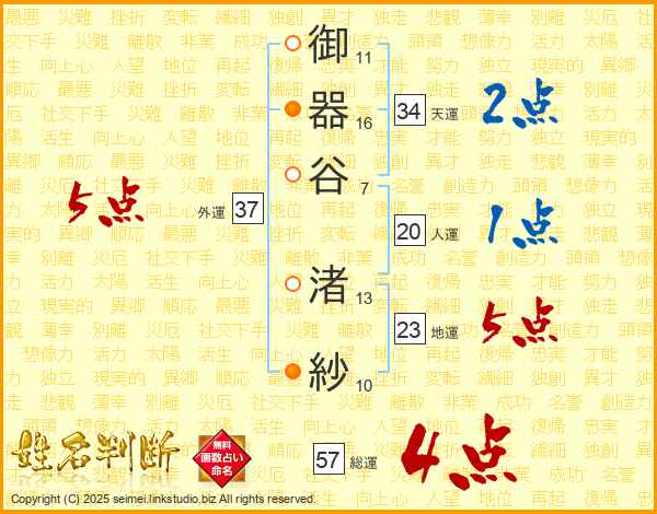 御器谷渚紗さんの外運は37画の5点!