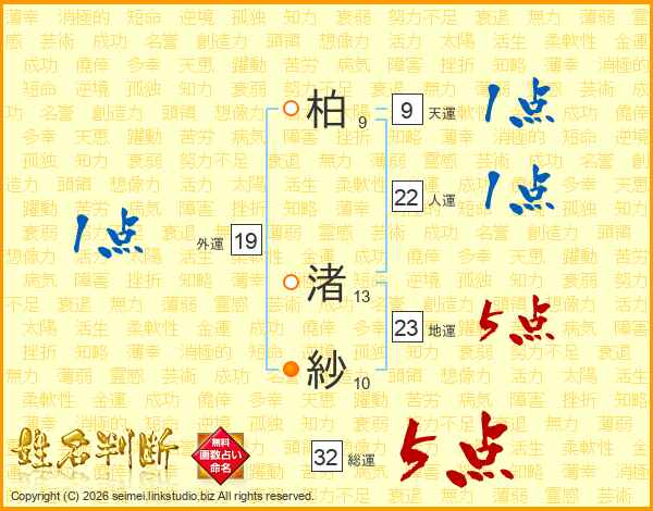 あなたの人生を表す1番重要な運勢です。生涯を通じて影響する総合運となり、主に50歳以降の晩年期に影響を及ぼします。苗字と名前の合計画数。
