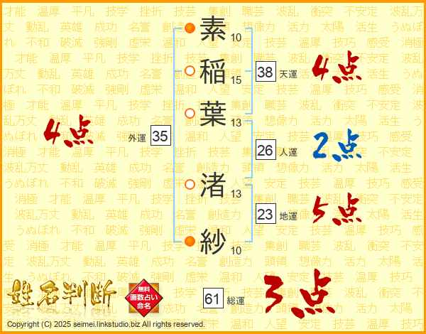 素(10画)稲(15画)葉(13画) 渚(13画)紗(10画)