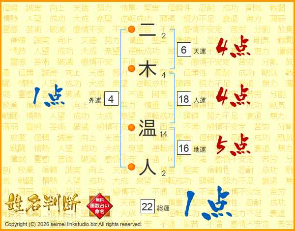 生活面を象徴する運勢です。外部から受ける影響力を表し、結婚運、家庭運や職場、環境への順応性を表します。総運から人運を引いた画数。姓や名が1文字の場合を除く。