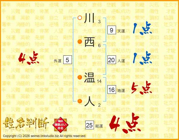 川西温人さんの総運は25画の4点!
