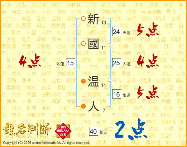 生活面を象徴する運勢です。外部から受ける影響力を表し、結婚運、家庭運や職場、環境への順応性を表します。総運から人運を引いた画数。姓や名が1文字の場合を除く。