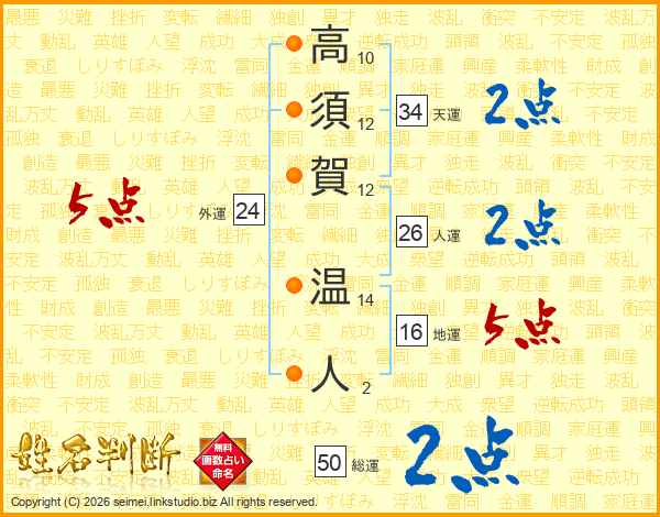 高(10画)須(12画)賀(12画) 温(14画)人(2画)