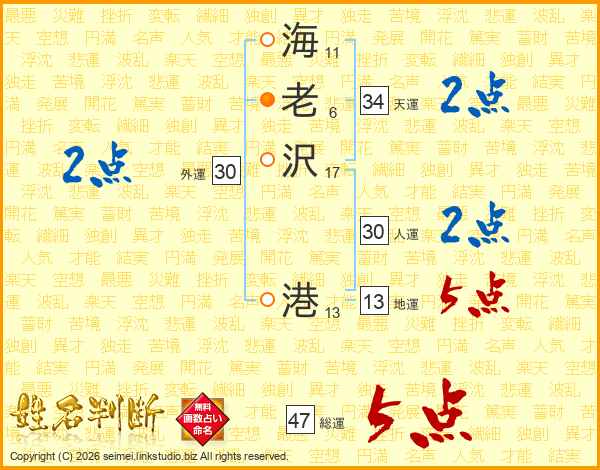 あなたの人生を表す1番重要な運勢です。生涯を通じて影響する総合運となり、主に50歳以降の晩年期に影響を及ぼします。苗字と名前の合計画数。