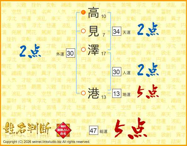 生活面を象徴する運勢です。外部から受ける影響力を表し、結婚運、家庭運や職場、環境への順応性を表します。総運から人運を引いた画数。姓や名が1文字の場合を除く。