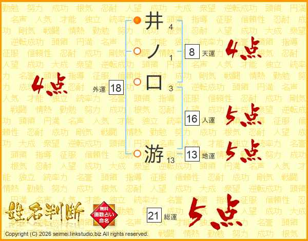 あなたの人生を表す1番重要な運勢です。生涯を通じて影響する総合運となり、主に50歳以降の晩年期に影響を及ぼします。苗字と名前の合計画数。