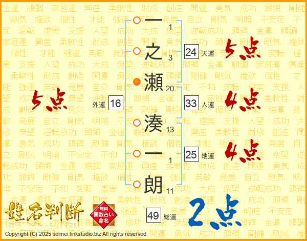 一(1画)之(3画)瀬(20画) 湊(13画)一(1画)朗(11画)