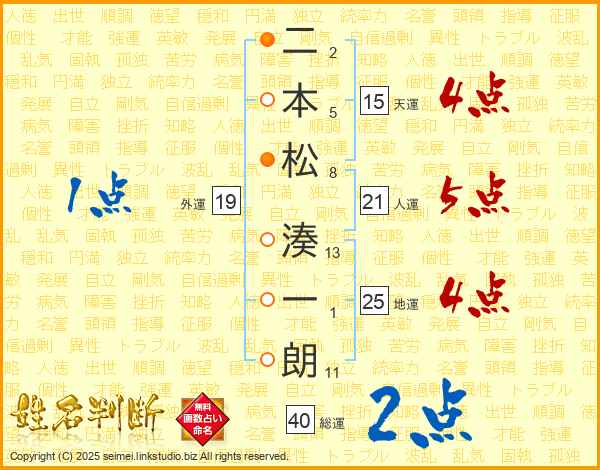 あなたの人生を表す1番重要な運勢です。生涯を通じて影響する総合運となり、主に50歳以降の晩年期に影響を及ぼします。苗字と名前の合計画数。