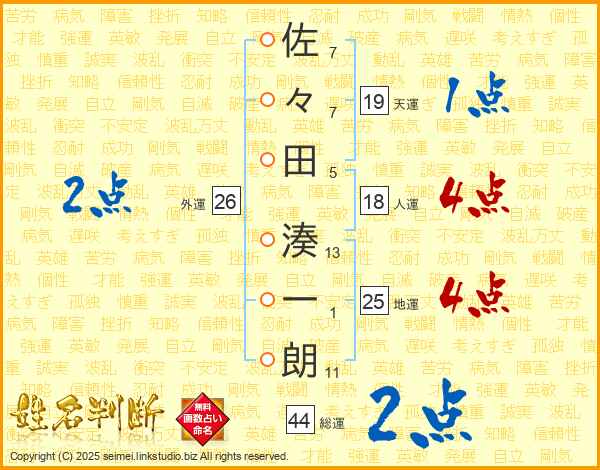 佐々田湊一朗さんの地運は25画の4点!
