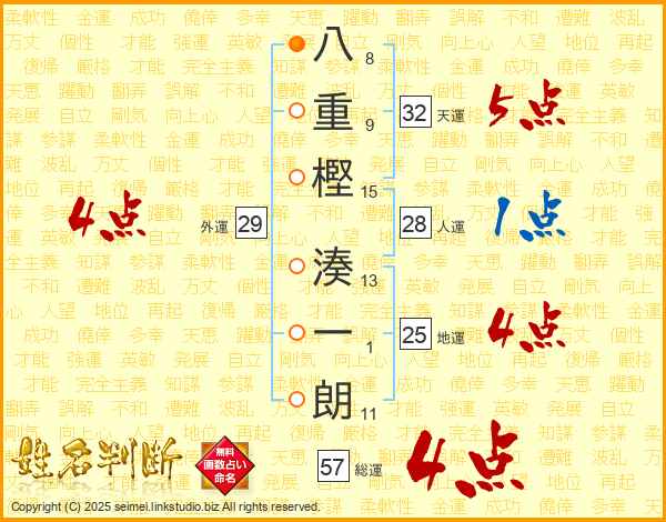 八(8画)重(9画)樫(15画) 湊(13画)一(1画)朗(11画)