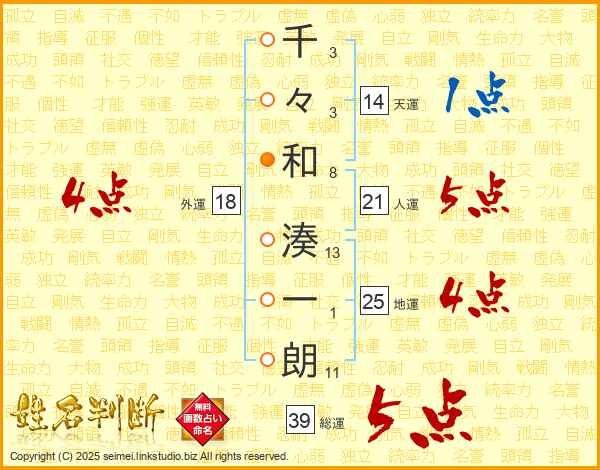 千(3画)々(3画)和(8画) 湊(13画)一(1画)朗(11画)