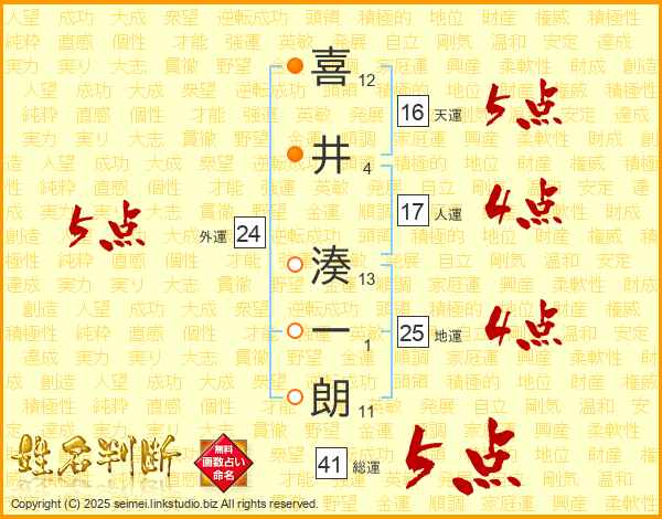 喜(12画)井(4画) 湊(13画)一(1画)朗(11画)
