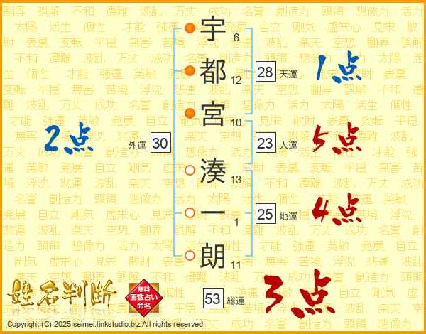 宇(6画)都(12画)宮(10画) 湊(13画)一(1画)朗(11画)