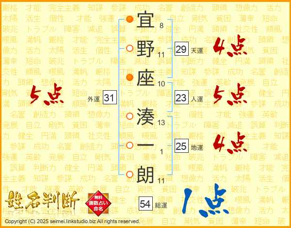 宜(8画)野(11画)座(10画) 湊(13画)一(1画)朗(11画)