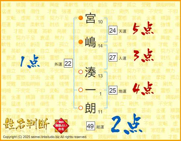 宮(10画)嶋(14画) 湊(13画)一(1画)朗(11画)