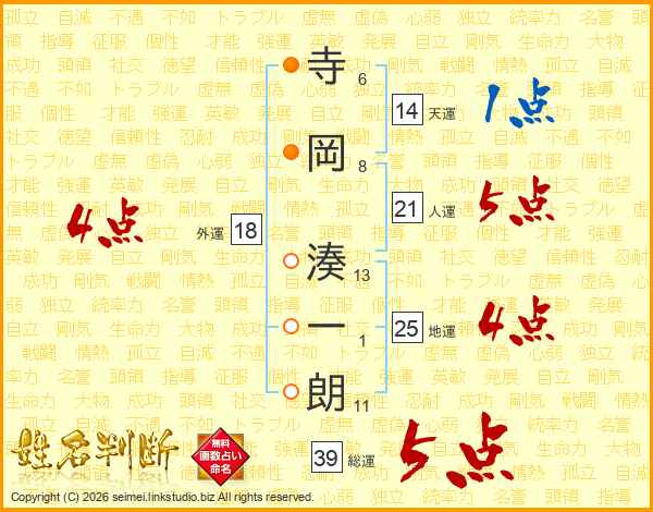 寺(6画)岡(8画) 湊(13画)一(1画)朗(11画)