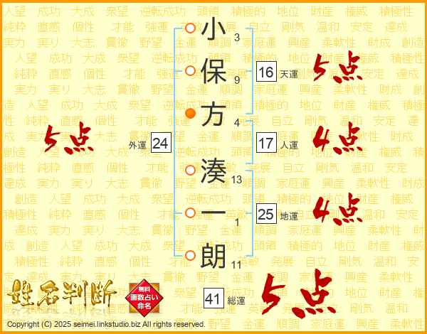 小(3画)保(9画)方(4画) 湊(13画)一(1画)朗(11画)