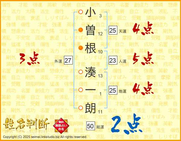 小(3画)曽(12画)根(10画) 湊(13画)一(1画)朗(11画)