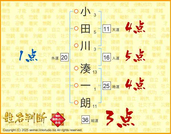 生活面を象徴する運勢です。外部から受ける影響力を表し、結婚運、家庭運や職場、環境への順応性を表します。総運から人運を引いた画数。姓や名が1文字の場合を除く。