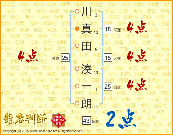 川(3画)真(10画)田(5画) 湊(13画)一(1画)朗(11画)