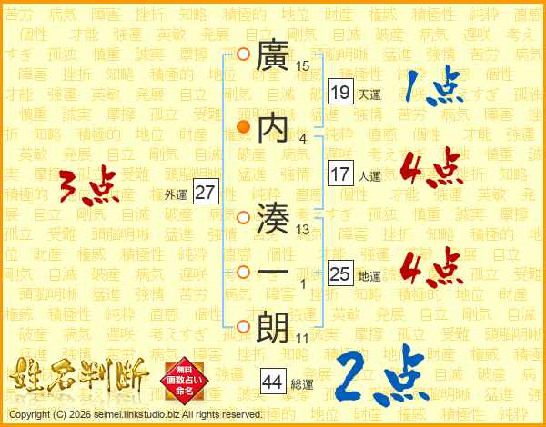 廣(15画)内(4画) 湊(13画)一(1画)朗(11画)