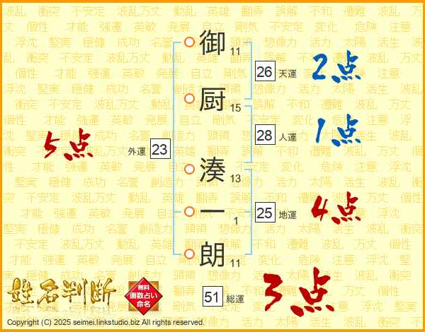 御(11画)厨(15画) 湊(13画)一(1画)朗(11画)