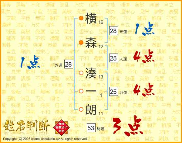 横(16画)森(12画) 湊(13画)一(1画)朗(11画)