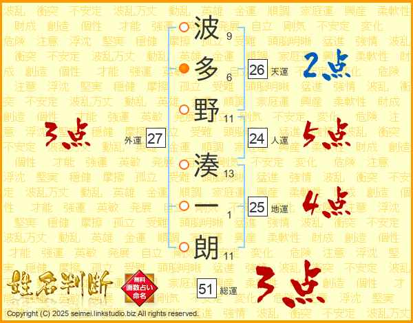 波(9画)多(6画)野(11画) 湊(13画)一(1画)朗(11画)