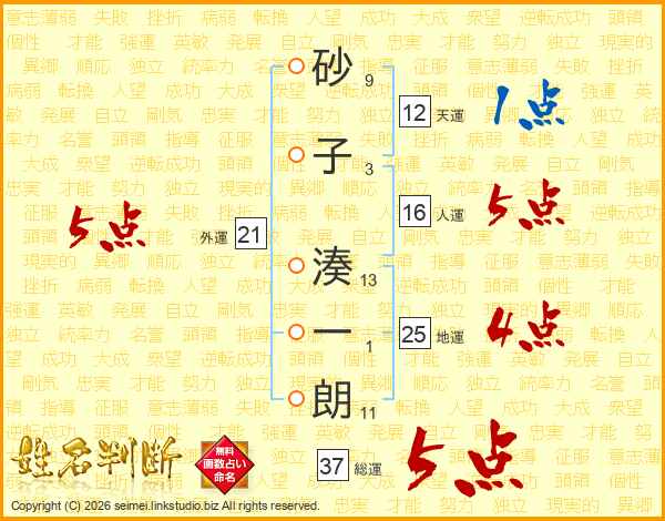 砂(9画)子(3画) 湊(13画)一(1画)朗(11画)