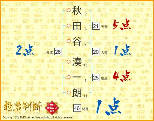 秋(9画)田(5画)谷(7画) 湊(13画)一(1画)朗(11画)