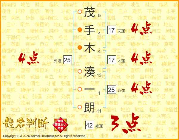茂(9画)手(4画)木(4画) 湊(13画)一(1画)朗(11画)