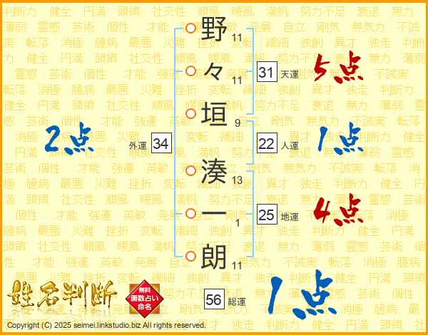 野(11画)々(11画)垣(9画) 湊(13画)一(1画)朗(11画)