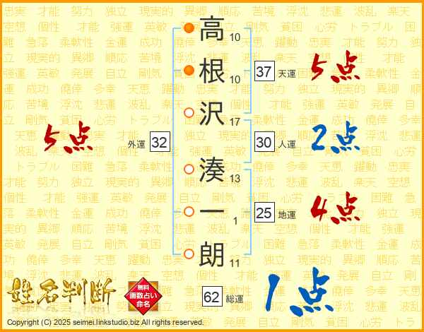 高(10画)根(10画)沢(17画) 湊(13画)一(1画)朗(11画)