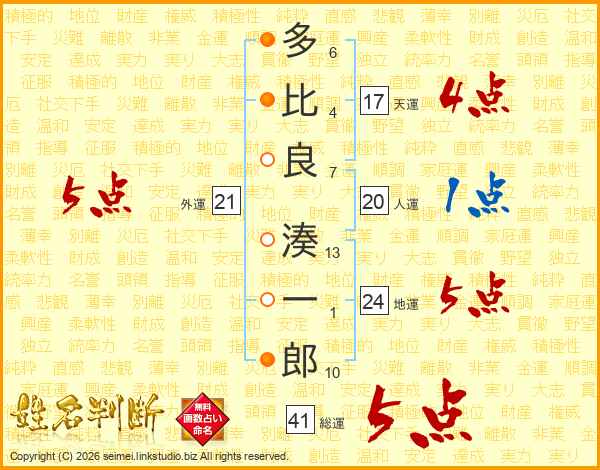 多(6画)比(4画)良(7画) 湊(13画)一(1画)郎(10画)